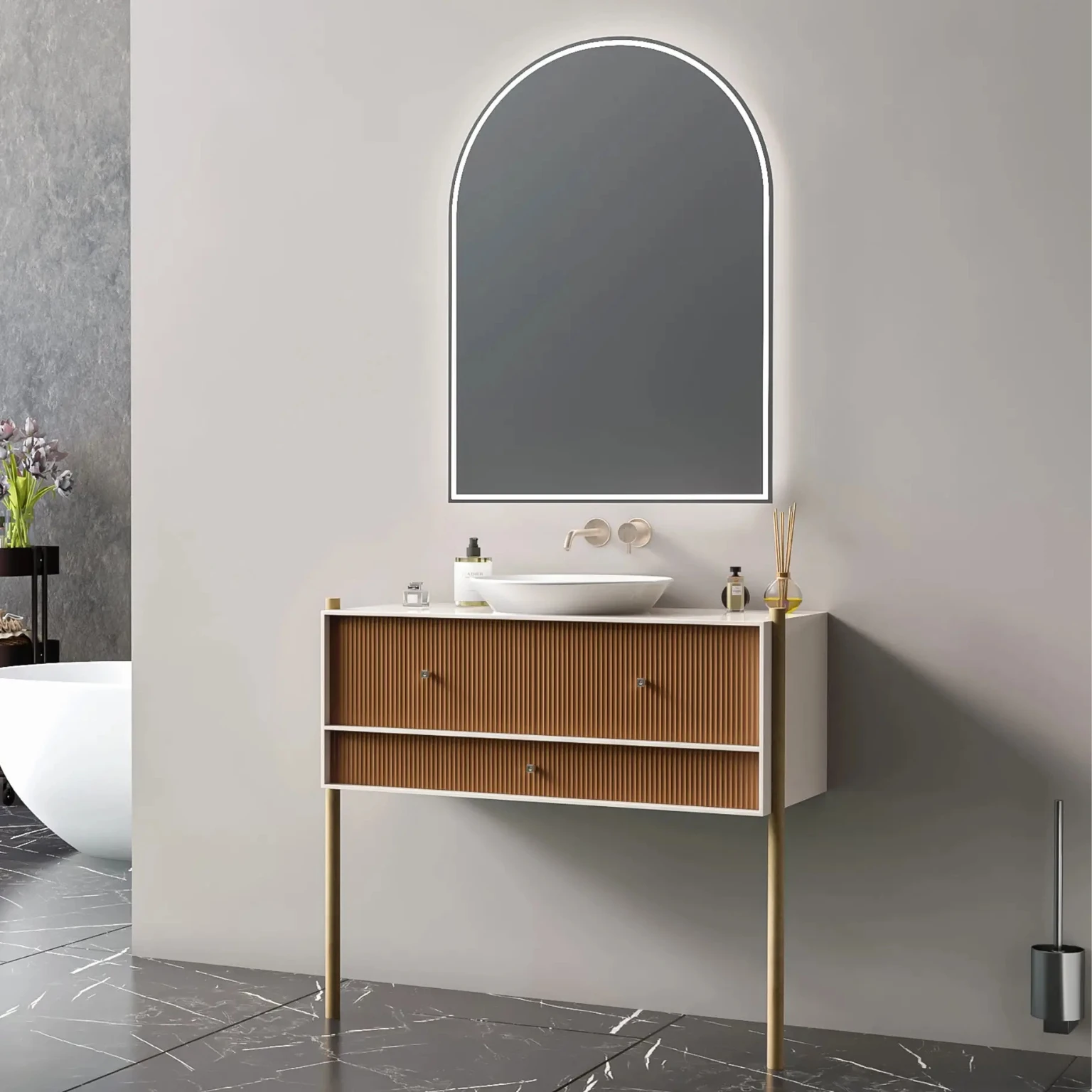 Klasik ayaklı tasarımın modern yorumu. Banyo Point Axis Banyo Dolabı, gövdesindeki özel oluklu (yivli) işçilik ve kemer formundaki aynasıyla banyonuza mimari bir derinlik katar. Yüksek ayaklı yapısı sayesinde hem sağlam duruş sergiler hem de temizlik kolaylığı sağlar.