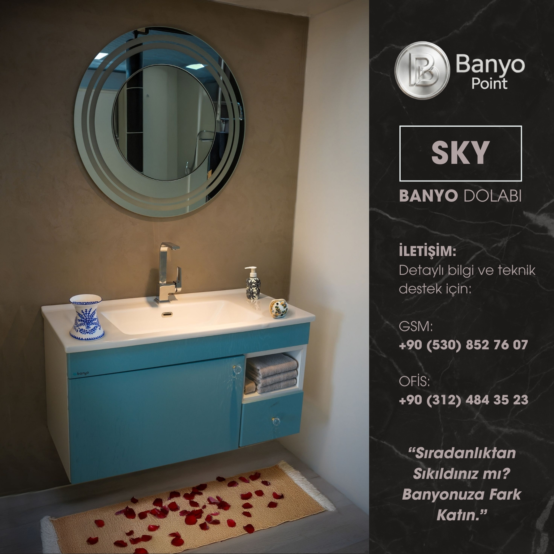 Mekanınızı boğmayan soft mavi rengi, beyaz seramik detaylarla birleşerek temiz ve aydınlık bir görünüm sağlar. Mavi banyo dolabı arayanlar için Sky, sadece bir mobilya değil, banyonun havasını değiştiren bir stil ikonudur.